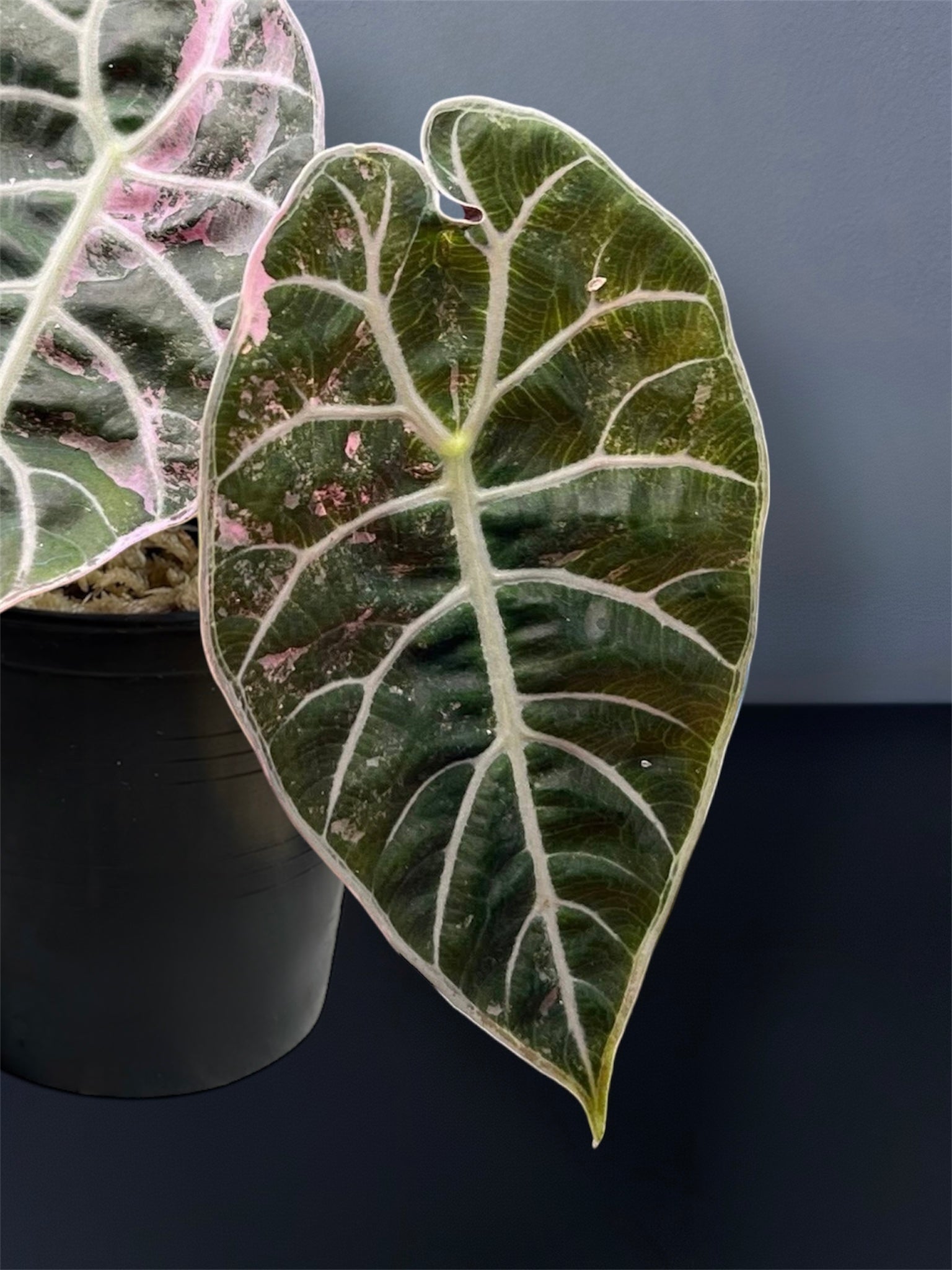 The Alocasia Watsoniana Pink Variegated is an rare variety, distinguished by its large, elongated deep green leaves adorned with soft to vibrant pink variegation and prominent contrasting veins.