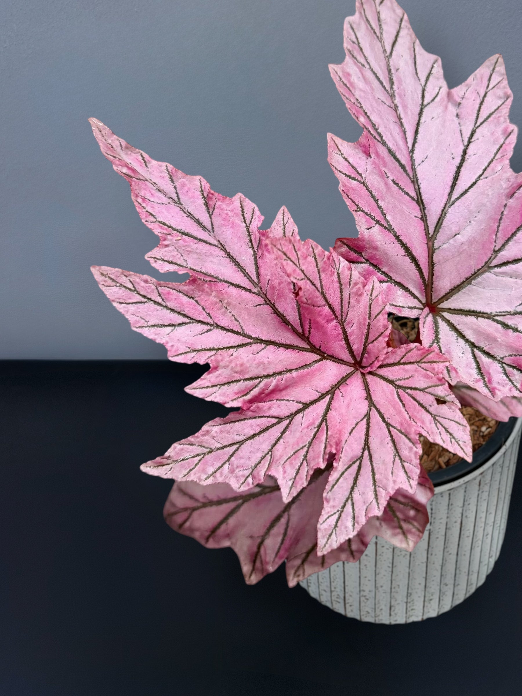 The Begonia Lamoon Variegated features broad, textured leaves with a rich green base highlighted by soft creamy to pale yellow variegation. The subtle contrast and gentle marbling give the foliage a refined and decorative appearance. Its balanced growth habit makes it well suited for bright indoor environments.