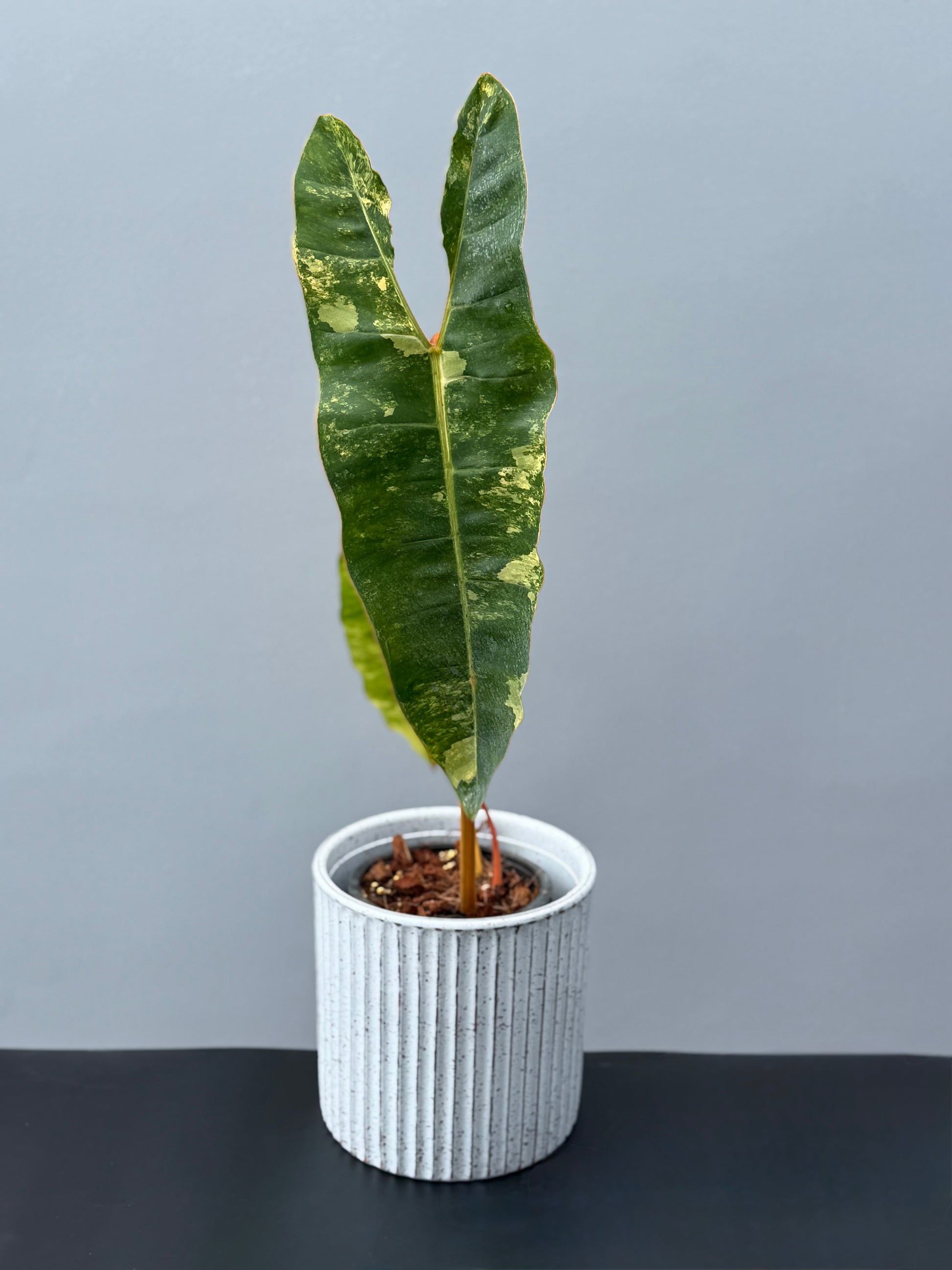The Philodendron Billietiae Variegated is a rare and highly sought-after tropical plant, renowned for its long arrow-shaped leaves and uniquely charming copper-colored petioles.