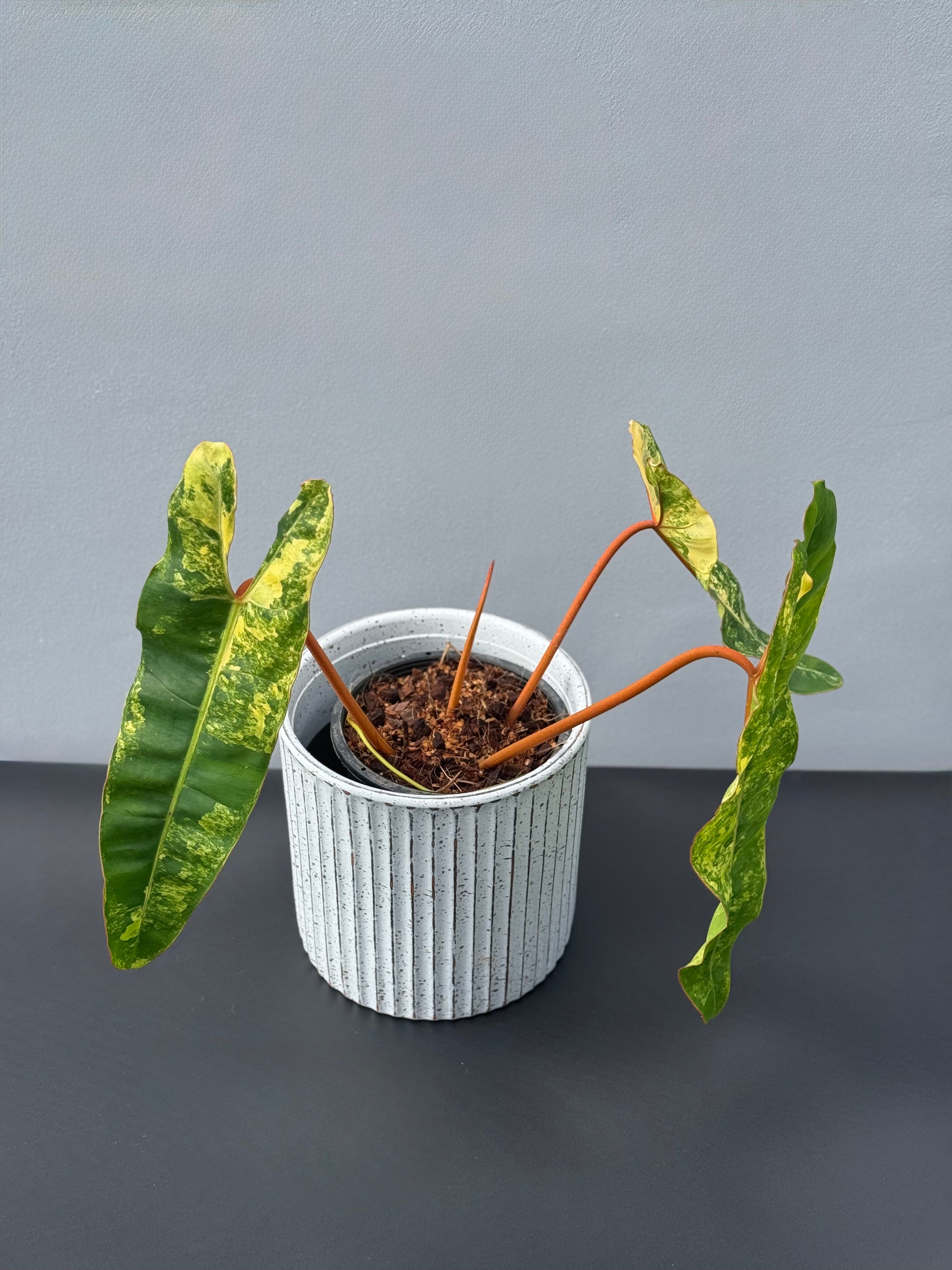 The Philodendron Billietiae Variegated is a rare and highly sought-after tropical plant, renowned for its long arrow-shaped leaves and uniquely charming copper-colored petioles.