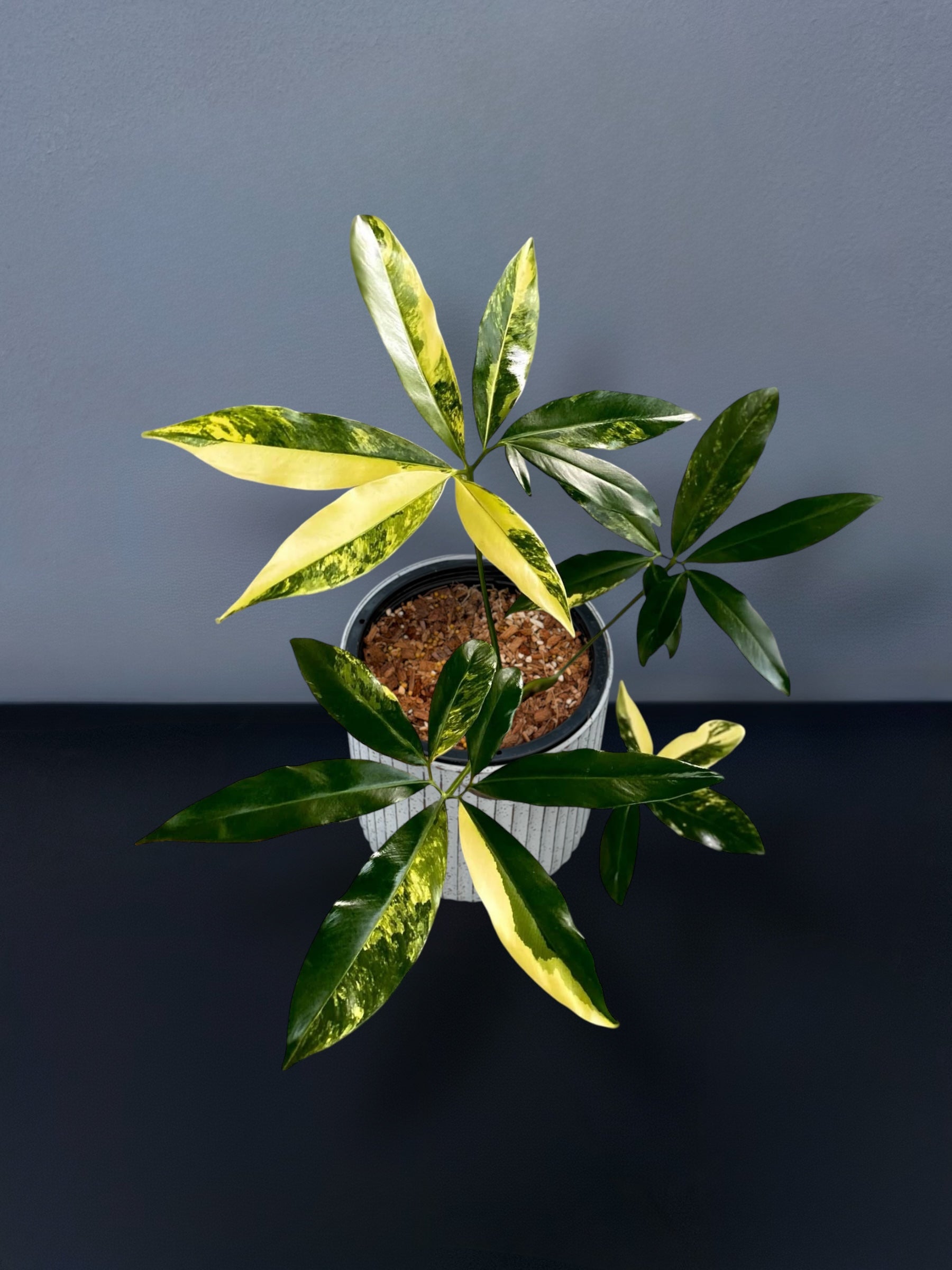 The Philodendron Goeldii Variegated is a rare and architectural variety known for its distinctive, radial leaf arrangement and soft variegation in cream and light green tones. The unique growth pattern gives the plant a sculptural appearance, while the gentle color contrast keeps it balanced and refined.