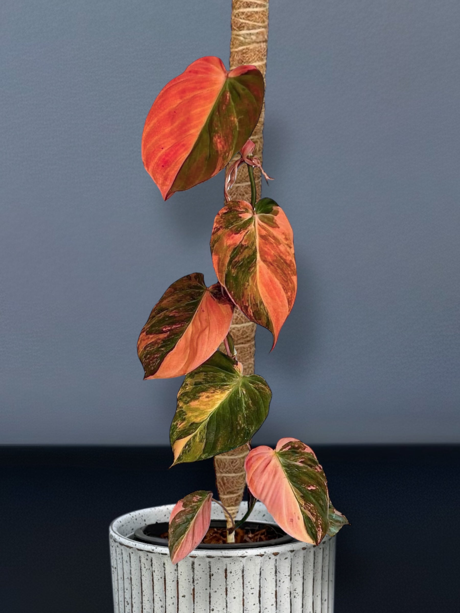 The Philodendron Mican Pink Variegated is a rare and highly ornamental variety, admired for its velvety, heart-shaped leaves and soft pink variegation. The delicate blush tones contrast beautifully with the deep green to bronze foliage, creating a refined and elegant appearance.