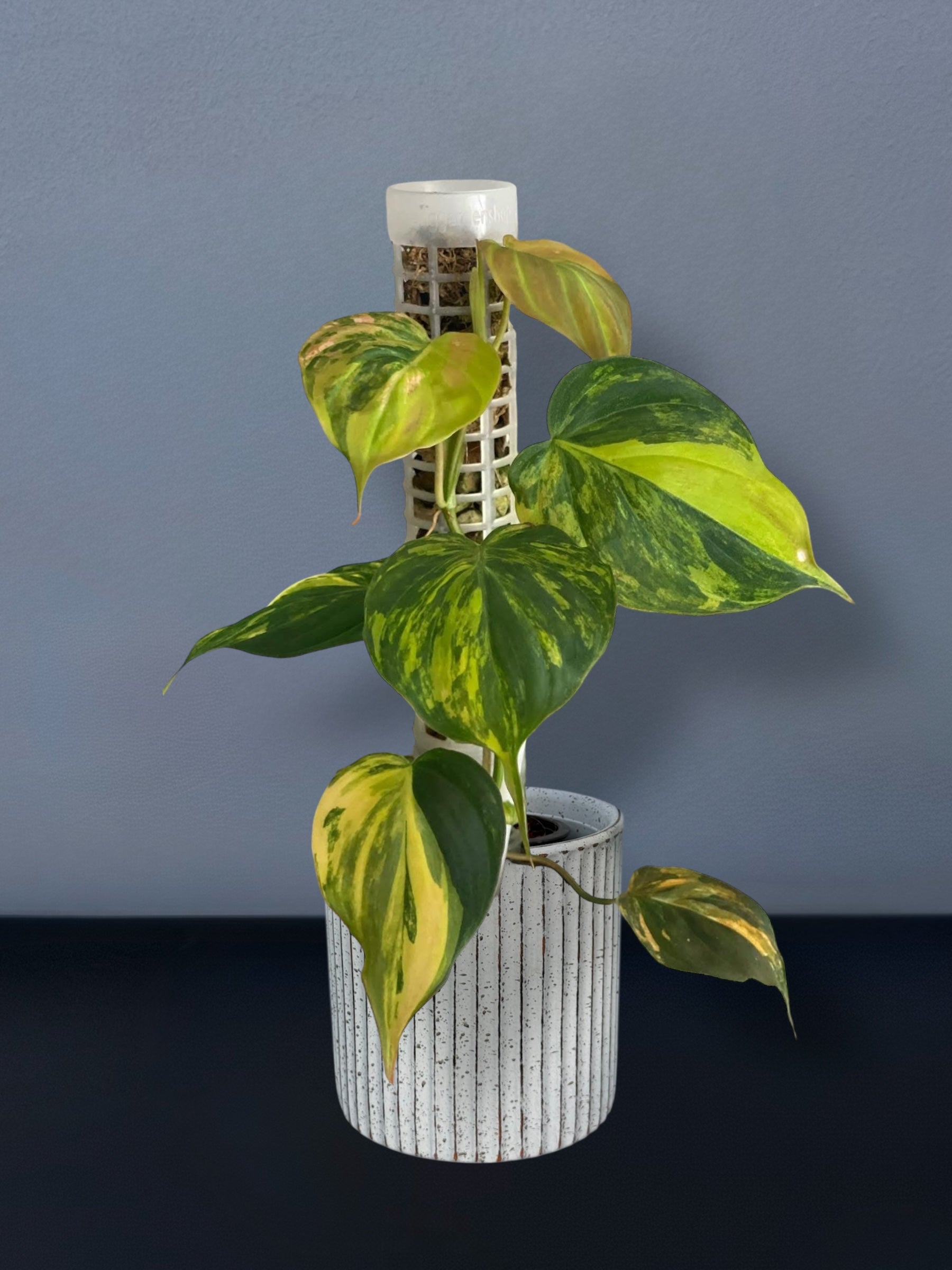 The Philodendron Mican Variegated is a rare form of the classic Mican, appreciated for its soft, velvety leaves and gentle variegation in cream and light green tones. The subtle color variations blend naturally with the deep green foliage, giving the plant a calm and balanced appearance.